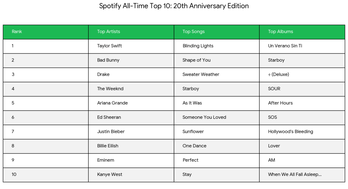 To celebrate its milestone 20th anniversary on Thursday, the streaming giant pulled back the curtain on its historical data, revealing the top-performing artists, songs, albums, and podcasts since the platform’s inception.